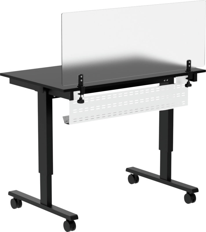 Kabelový kanál částečně blokuje výhled pod stůl a slouží také jako vizuální štít