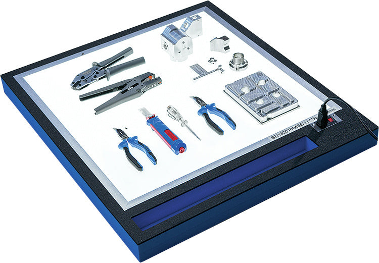 Krok 1: Rozhodněte se, jak chcete nářadí uspořádat a rozdělit a položte jej do referenčního rámečku na bílé ploše světelné skříňky / světelného panelu.