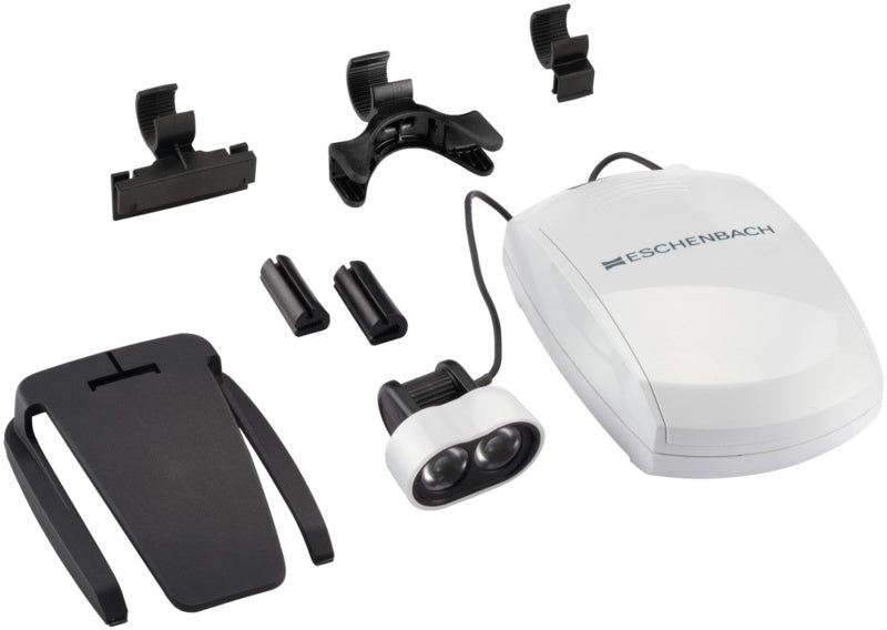 Svítilna LED se k brýlím snadno upevňuje pomocí spony. Uživatelé nenosící brýle mohou svítilnu umístit také na stojan.