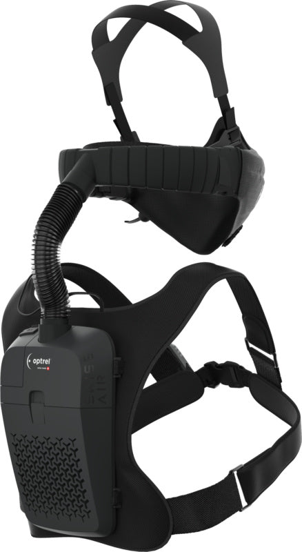 Tvořená pohodlnou poloobličejovou maskou, jednotkou ventilátoru, přívody hadic, popruhem na hlavu a krk, ramenní opěrkou, ovládacím panelem, nabíječkou a batohem