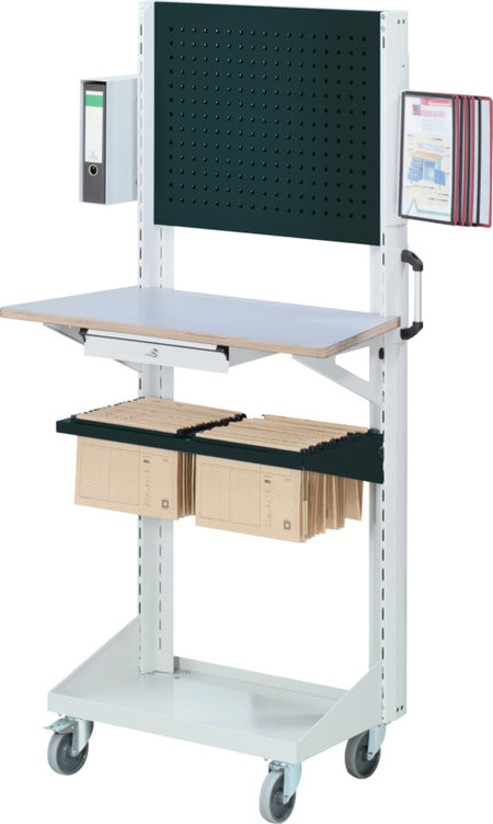 Psací pult, závěsná zásuvka, průhledné tabulky, registratura, stěna z děrovaného plechu a závěsná registratura