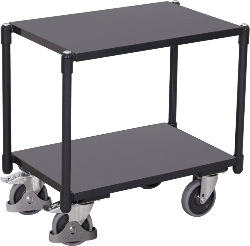 Svařovaná konstrukce z ocelových profilů, ložné plochy z lisovaných dřevěných desek, bukový povrch, vhodný pro plastový box 600x400 mm (Š/H), práškově lakovaný systémový vozík Euro, trvalá ochrana povrchu, nárazuvzdorné a poškrábané termoplastické gumové pneumatiky na plastových ráfcích s přesnými kuličkovými ložisky s hlubokými drážkami, šedá barva, nezanechává stopy, ochrana koleček a nohou, čtyři otočná kolečka (z toho dvě s brzdou).