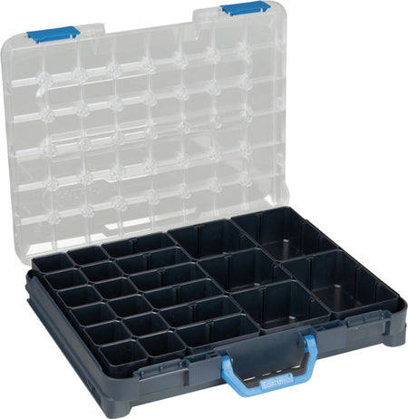 Průhledné víko zajišťuje okamžitý přehled a bezpečnou přepravu malých dílů. Speciální rošt a další víka nabízejí optimální úložný prostor a bezpečnost pro vložené boxy, aby se obsah nesmíchal.