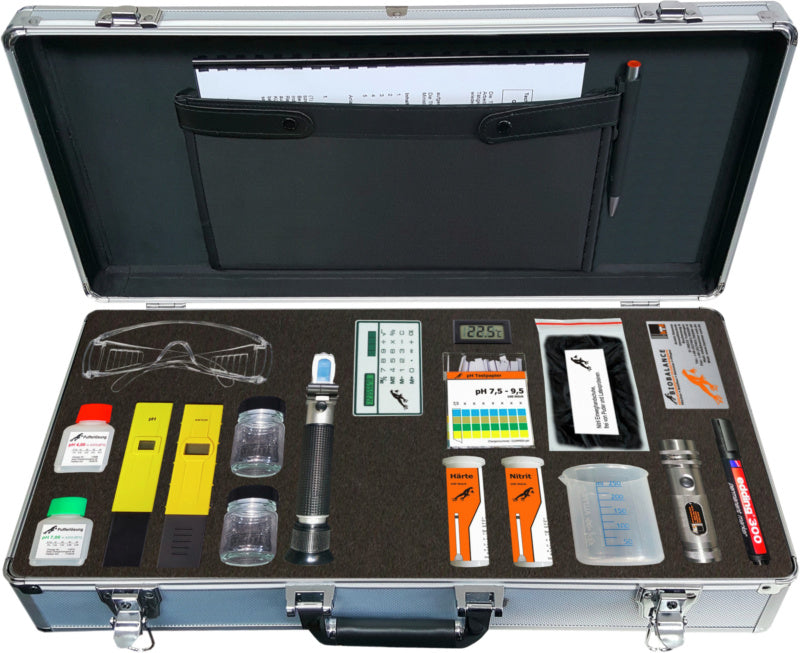 Obsah kufříku pro Exclusive: Viz standardní kufřík plus v každém následující: 1x přístroj pro měření vodivosti, 0–1999 us/cm, 1x měřicí přístroj na pH, 0–14 pH, 1x stabilizační roztok pH 4 až 7, 50 ml (pro nastavení měřicího přístroje na pH)