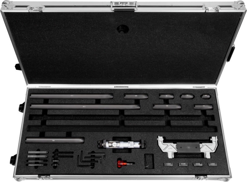 1 měřicí prvek, 1 pár válečkových měrek pro vnitřní měření, 1 pár válečkových měrek pro vnitřní a vnější měření, 1 pár válečkových měrek pro vnější měření, 1 nastavovací kalibr, 25 / 50 / 75 / 100 / 125mm nástavec, 150 / 300 / 450 / 600mm nástavec, 1 speciální šroubovák na nástavce, 1 sada podpůrného příslušenství, 1 dřevěné pouzdro