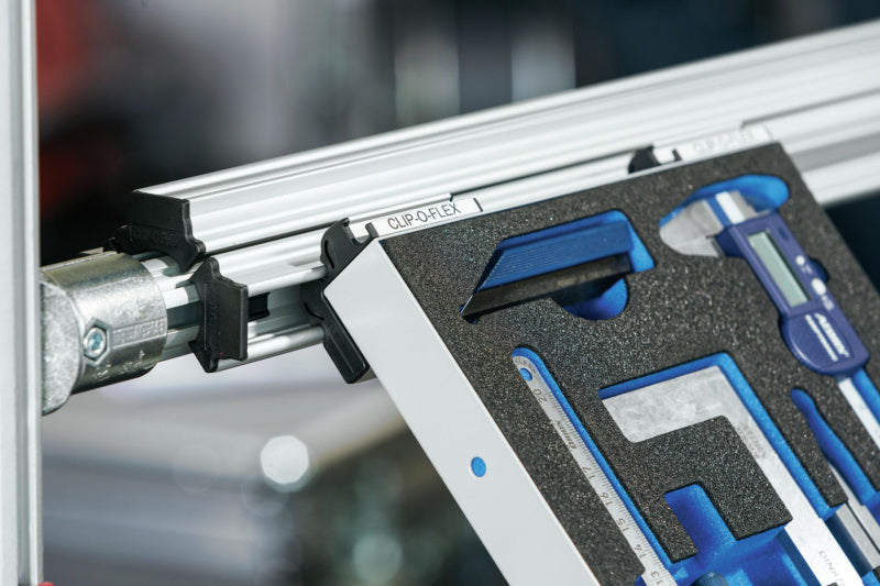 Nosné lišty CLIP-O-FLEX viz č. 50237 005–019, vhodné vložky z tvrdé pěny ATORN se sadou nářadí pro rozměry D x Š: 260 x 345 mm, viz od č. 50537 505–580