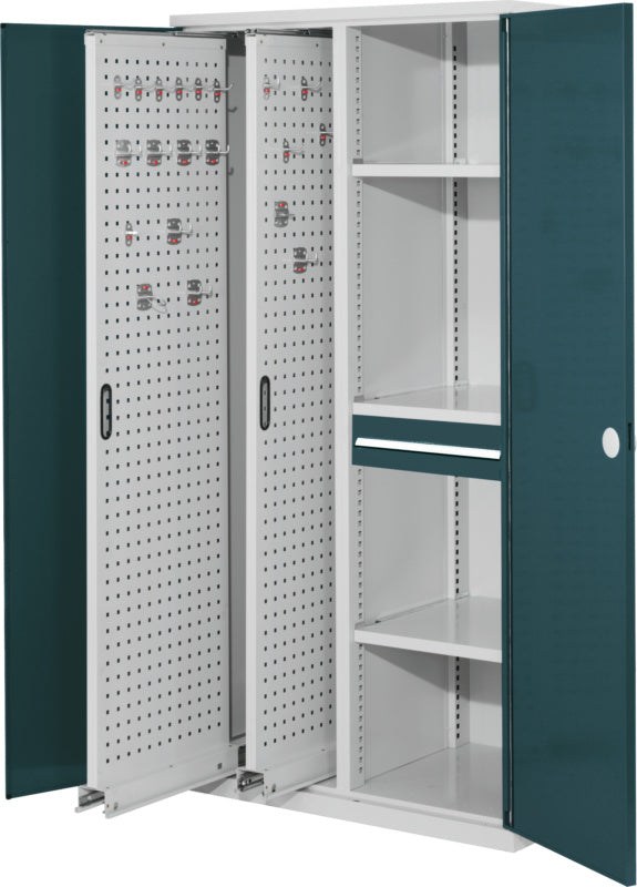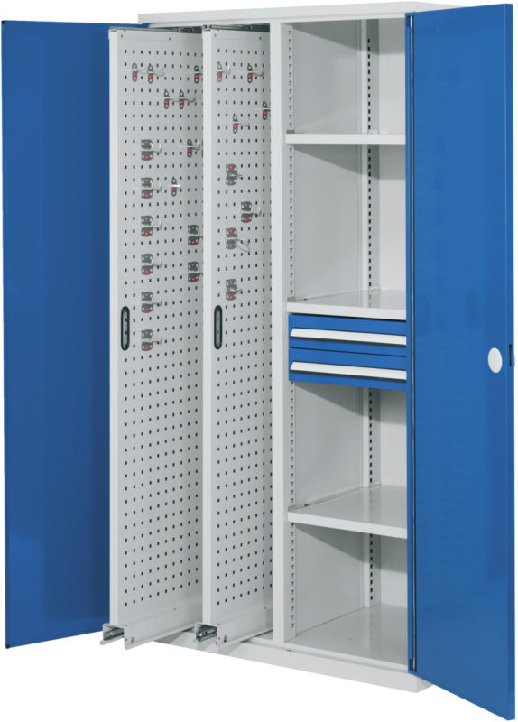 Využitelná plocha až 7,3 m při půdorysné ploše pouze 0,6 m. Ideální systém skříní pro bezpečné a dobře viditelné ukládání nářadí, klíčových profilů atd. na nejmenším možném prostoru. Vertikální skříně jsou vybaveny kombinací výsuvných regálů, ocelových polic a zásuvek.