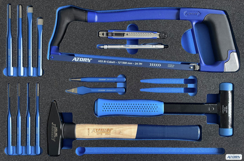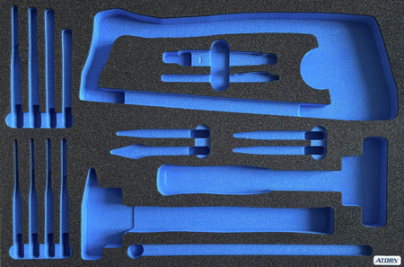 Přesné výřezy v kontrastní modré barvě zaručují snadné zjištění, zda nechybí nějaké nástroje a brání ztrátě nástrojů