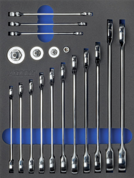 Vložka z tvrdé pěny s nářadím, sada ráčen a očkových otevřených klíčů