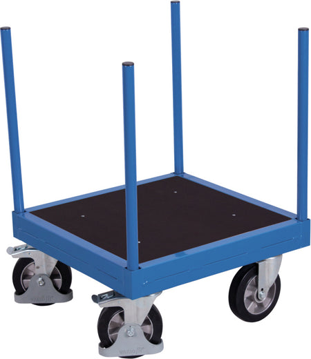 Robustní, pevně svařovaná ocelová konstrukce se zásuvnými pozinkovanými ocelovými trubkami, délka 610 mm, čirá šířka mezi podpěrami: 625 mm, ložná plocha z voděodolné lepené překližky, lisovaný povrch, práškový lak, trvalá ochrana povrchu, nárazuvzdorná a oděruvzdorná, elastické celopryžové pneumatiky na litých hliníkových ráfcích s přesnými kuličkovými ložisky v hlubokých drážkách, chránič nohou, čtyři otočná kolečka (z toho dvě s brzdou).
