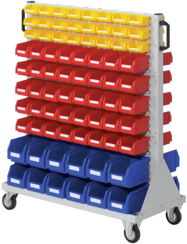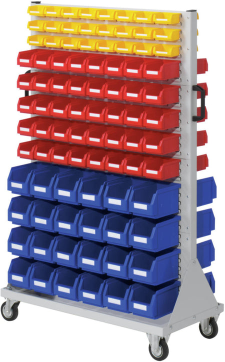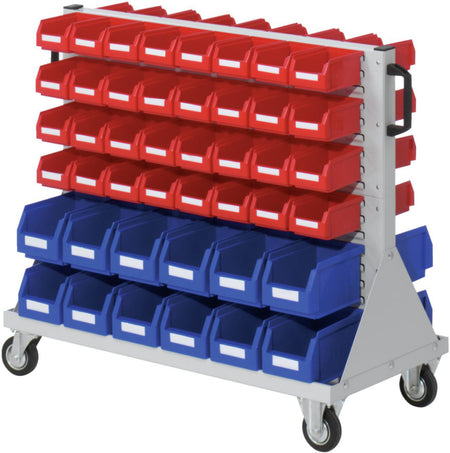 Se štěrbinovými panely, po obou stranách vybaveno průhlednými skladovacími krabicemi RASTERPLAN z nárazuvzdorného a otřesuvzdorného polyetylenu, barevné kódování