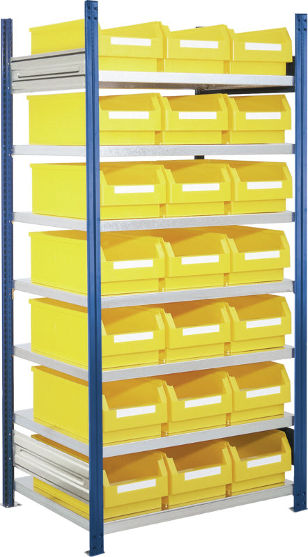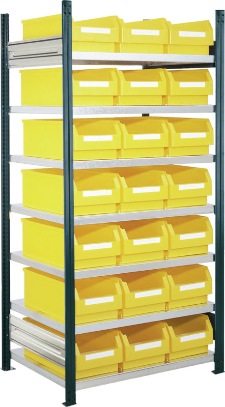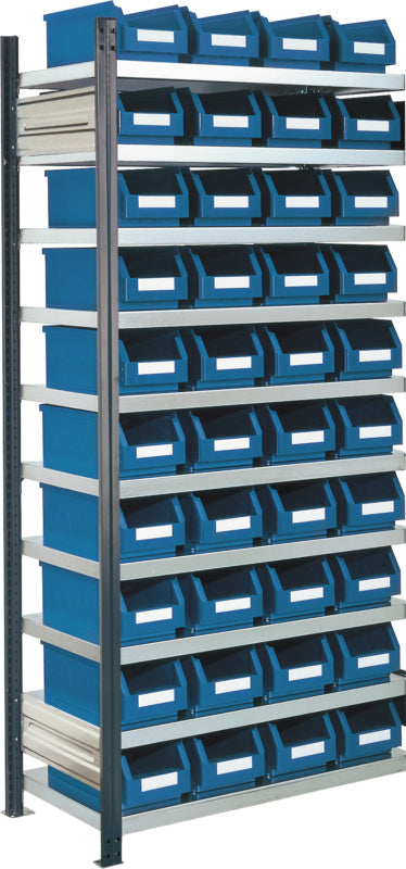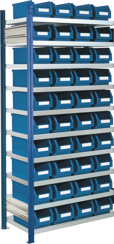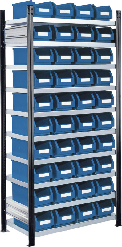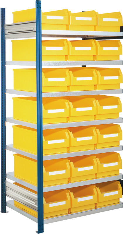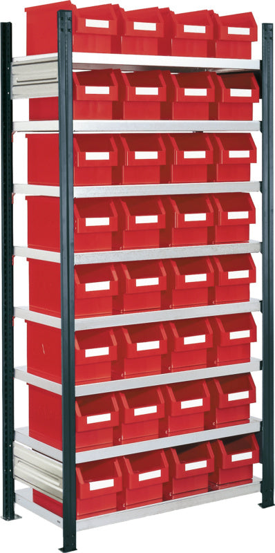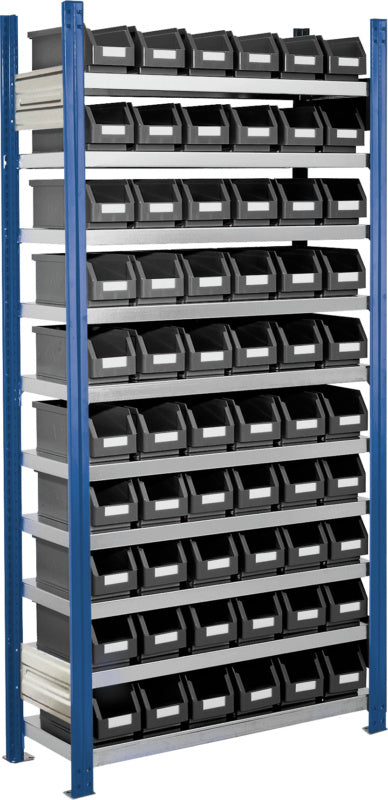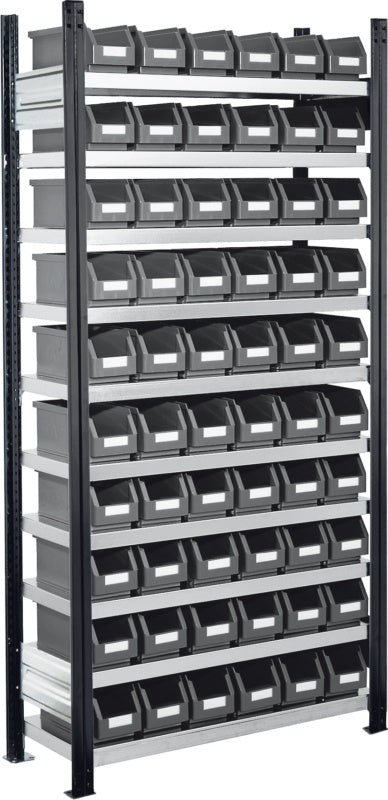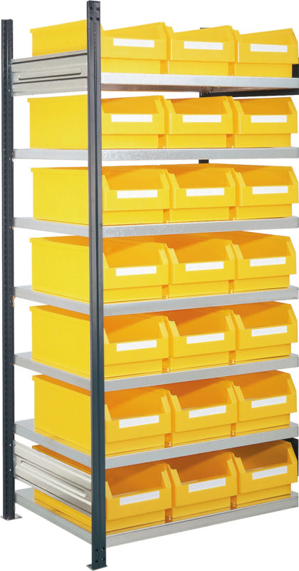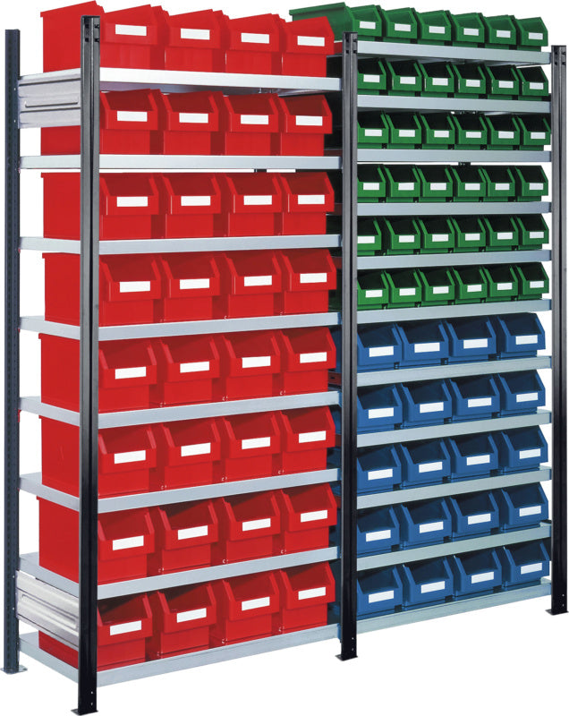 Pro přehledné skladování malých dílů v průhledných skladovacích krabicích; regálové systémy lze instalovat a demontovat díky základním a přídavným polím.
