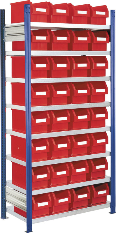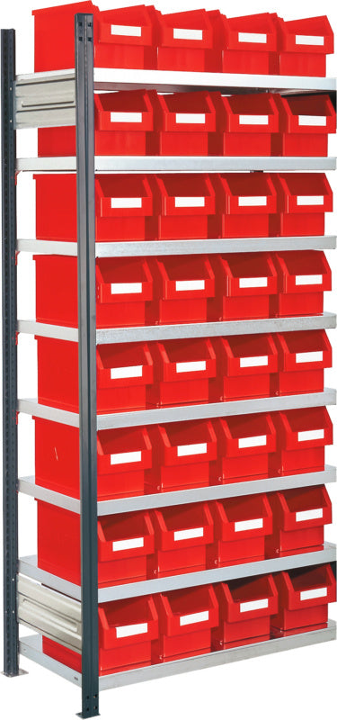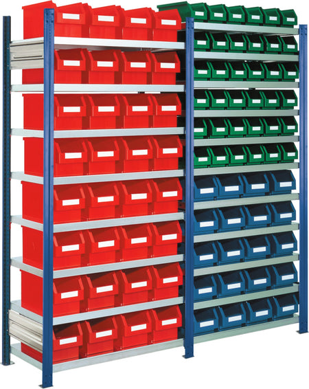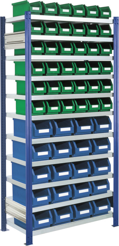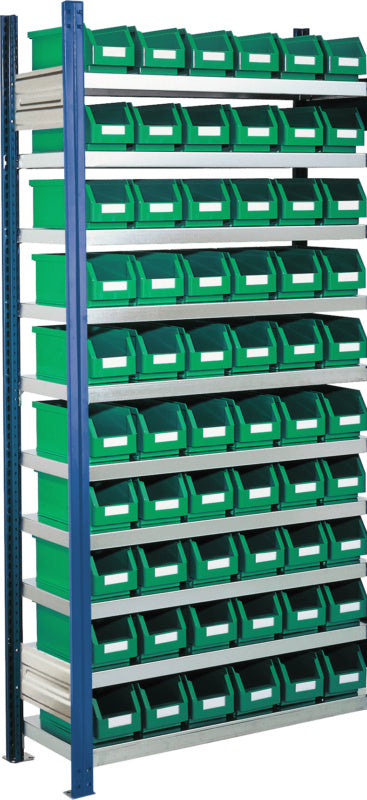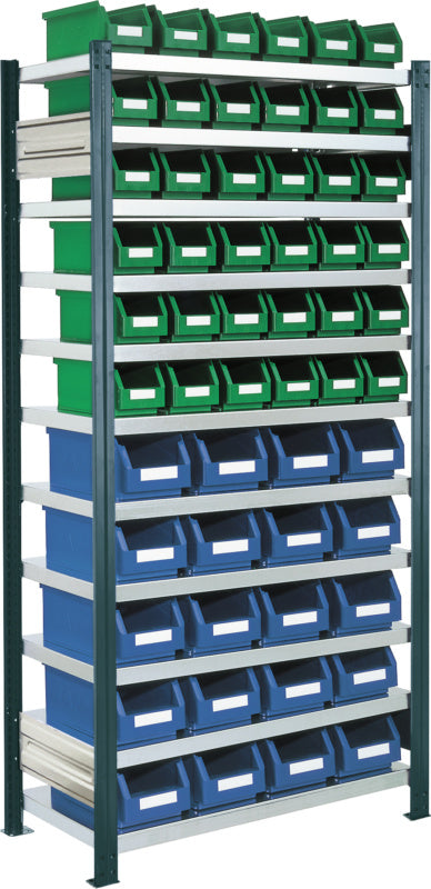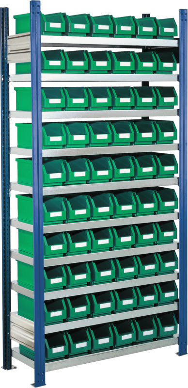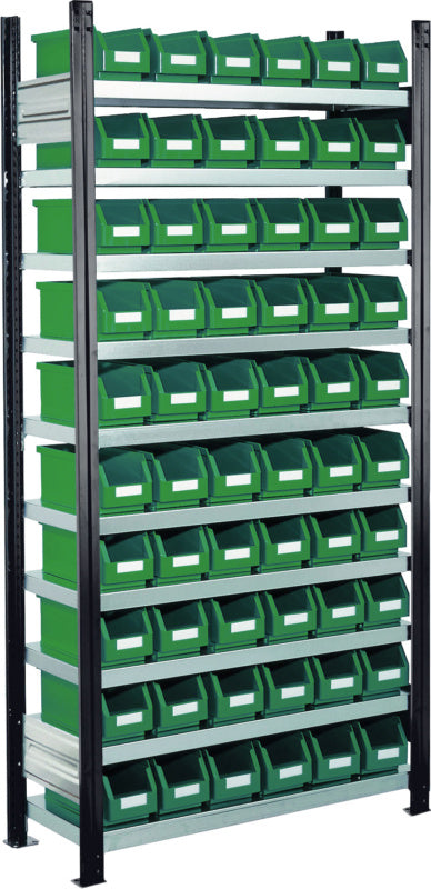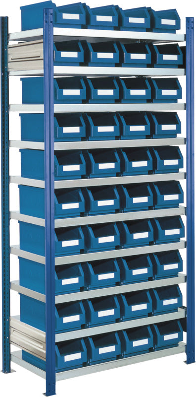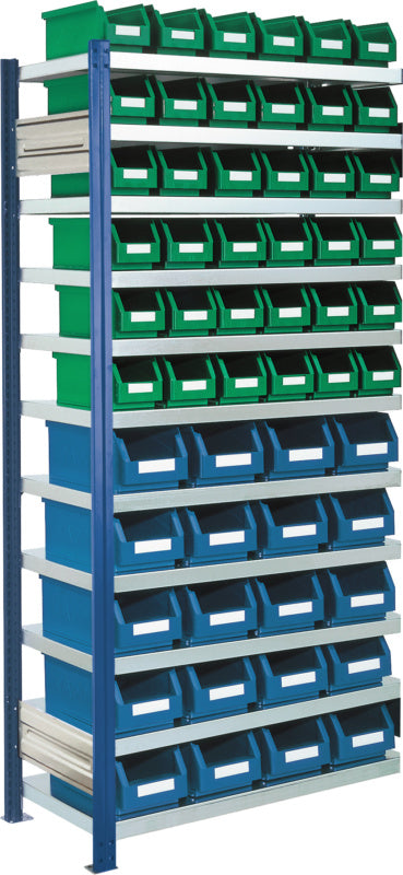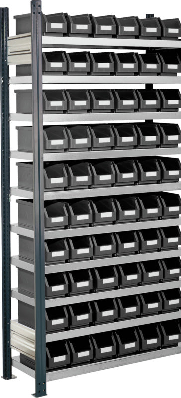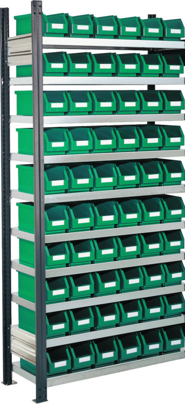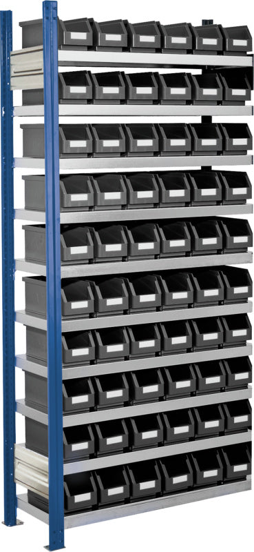 Pro přehledné skladování malých dílů v průhledných skladovacích krabicích; regálové systémy lze instalovat a demontovat díky základním a přídavným polím.